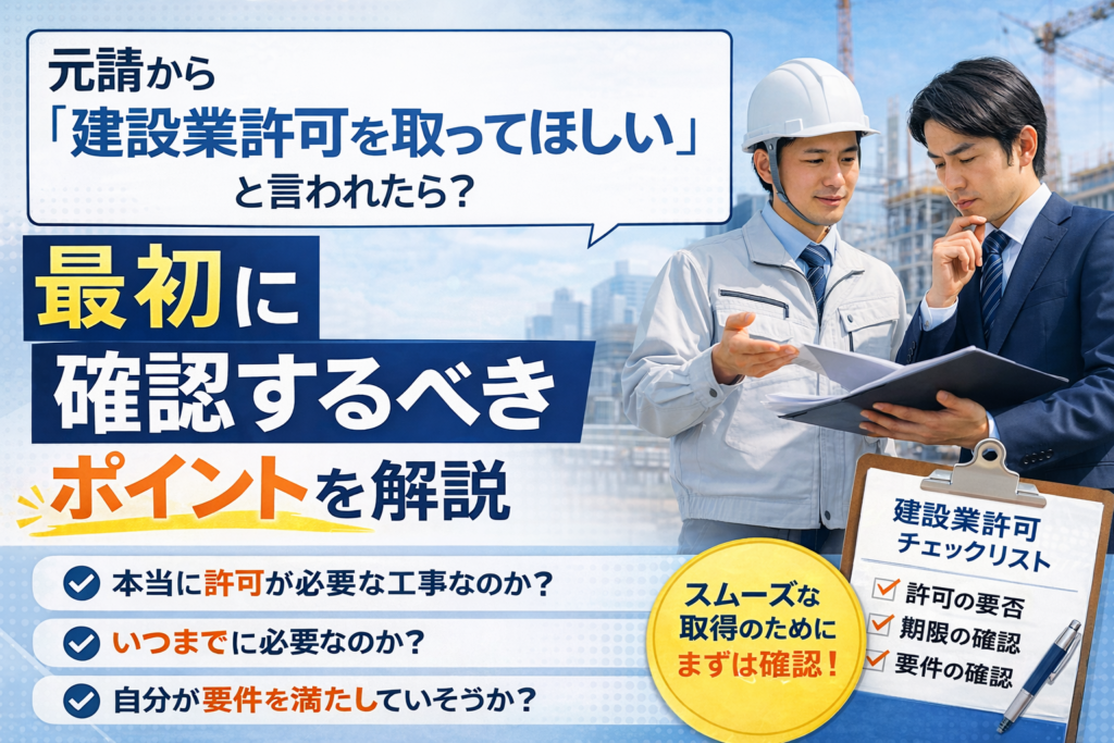 建設業を営んでいる方の中には、元請会社から突然 「今後も取引を続けるなら、建設業許可を取ってほしい」 と言われて、戸惑った経験がある方もいらっしゃるのではないでしょうか。 特に、これまで問題なく仕事をしてきた方ほど、 「急に言われても何から...